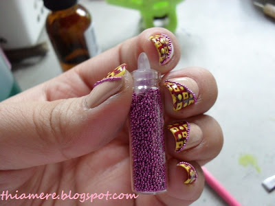 If you do nail arts, it's a must to have a cotton soaked with polish remover in cleaning your orange stick, nail pusher or dotting tool right next to you. I had a lot of good designs that got totally trashed all because lints kept on clinging to my tools...transferring to my wet nails therefore ruining my design that i worked so hard for. Grrrrrr!!!! Kuyashii~! Annoying!